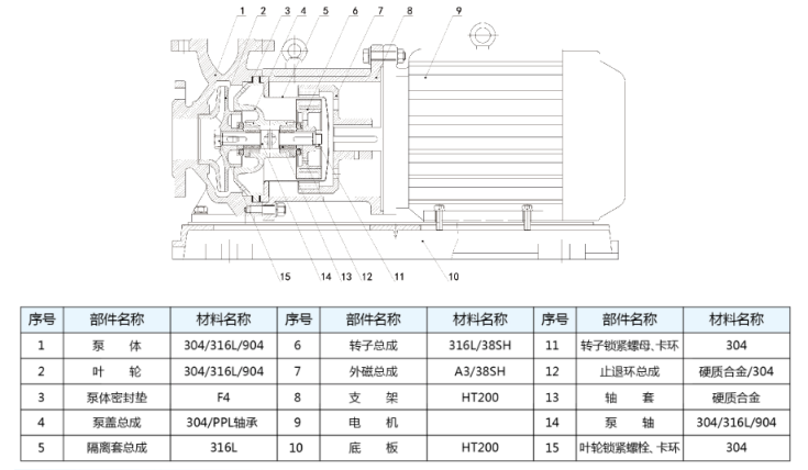 驅(qū)動(dòng)裝置采用主動(dòng)磁鐵聯(lián)軸器直接裝在電機(jī)軸上。泵室完全封閉。通過磁力偶合間接驅(qū)動(dòng)泵軸上帶磁鐵的葉輪旋轉(zhuǎn)結(jié)構(gòu)緊湊、安全節(jié)能。