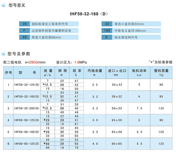 IHF(D)型離心泵是IHF型離心泵的派生產(chǎn)品,是為滿足IHF離心泵性能要求同時(shí)受工作場地限制而研制的產(chǎn)品。所有過流部件均采用氟塑料或氟塑料合金制造,耐腐蝕范圍廣;基體采用金屬制造,承壓能力強(qiáng);軸封采用先進(jìn)的WB2型外裝式波紋管機(jī)械密封,密封性能可靠;采用短支架直連結(jié)構(gòu),葉輪軸與電機(jī)軸采用可靠的莫氏錐度傳遞扭矩,泵機(jī)占地面積小。