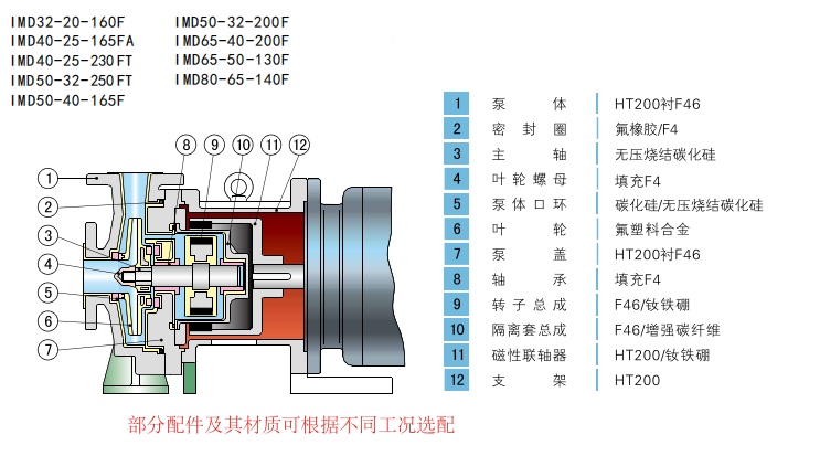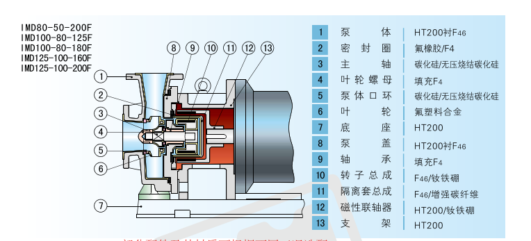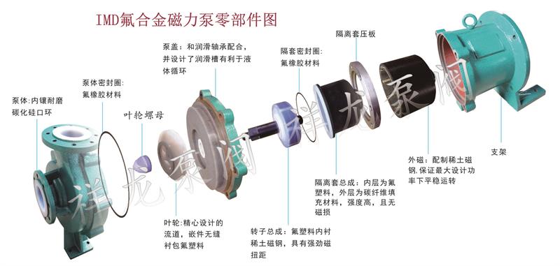 IMD系列磁力泵,流量:1~160m3/h;楊程17~62m,適用于輸送強(qiáng)腐蝕,易燃、易爆、有毒、易揮發(fā)的化學(xué)介質(zhì)。